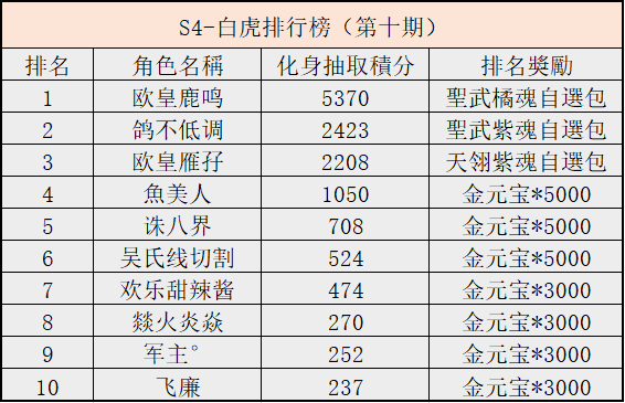 天下名將,榜上有禮第十期獲得排行榜及獎勵發放結果公示如下: