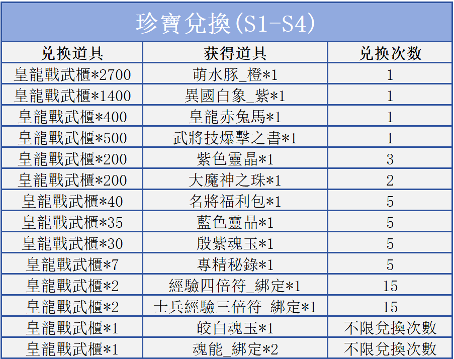 全服將優先上架以下名將之珠:典韋之珠*1,太史慈之珠*1,郭嘉之珠*1,徐庶之珠*1(S1~S4,每一場將上架1次)