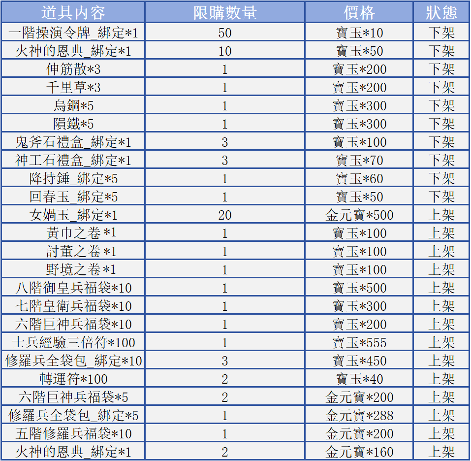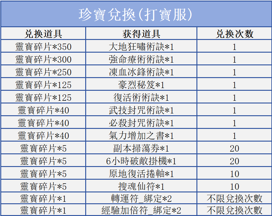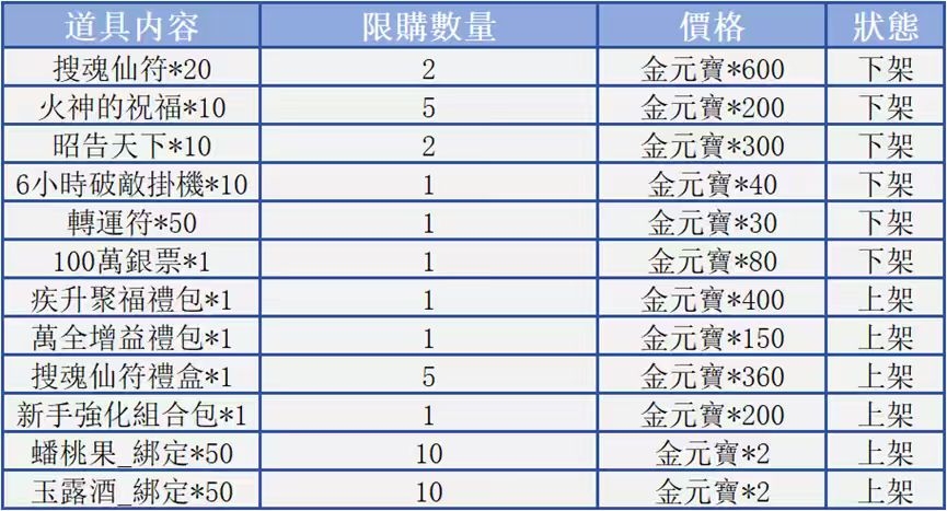 全服將優先上架以下技能書:金剛術訣、強命療術術訣、捆仙咒術訣、復療盾甲術訣、地矛專精書(S1~S4,每一場僅上架1次)