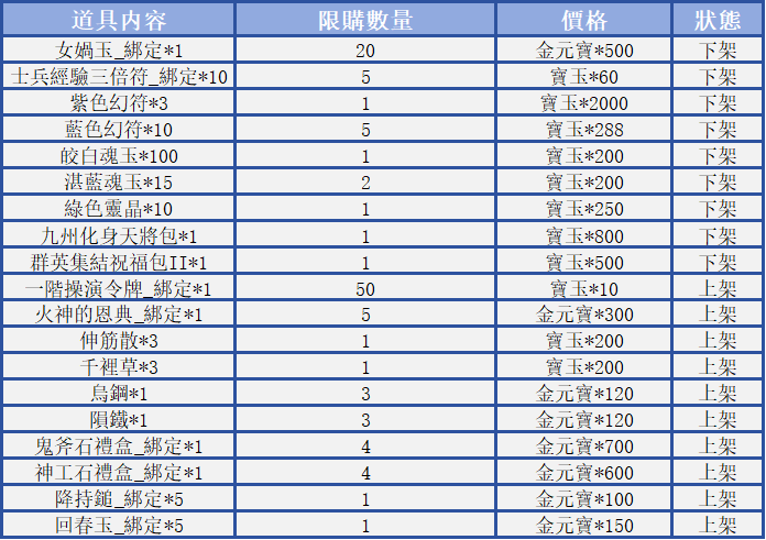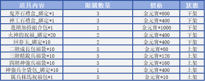S1~S4服將優先上架以下道具:潛能寶鑽_綁定、修復槌_綁定、高級修復槌_綁定(潛能寶鑽_綁定、高級修復槌_綁定,每一場上架5次;修復槌_綁定,每一場上架10次)